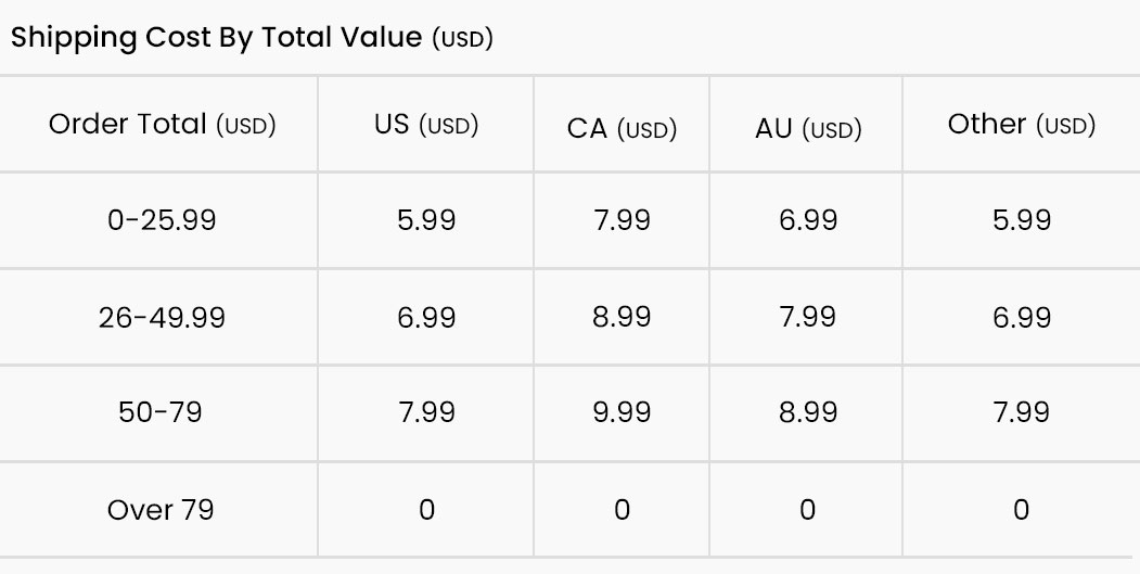 We offer free shipping for orders over $79. The following is our shipping cost sheet.